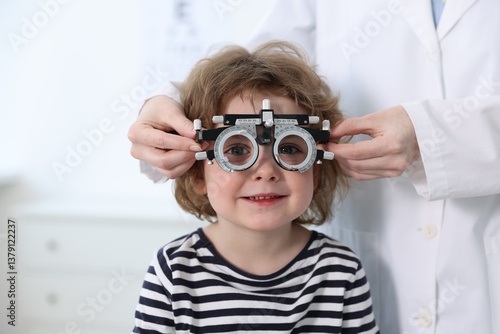 Ophthalmologist examining little boy's vision with trial frame in clinic, closeup