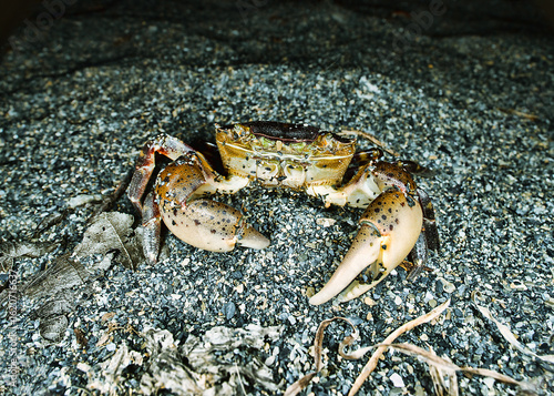Opportunistic omnivore, eurythermic, euryhaline invasive species Asian shore crab Hemigrapsus sanguineus on rocks, such as between boulders on rocky shores. Coast of Sea of Japan, Nakhodka port