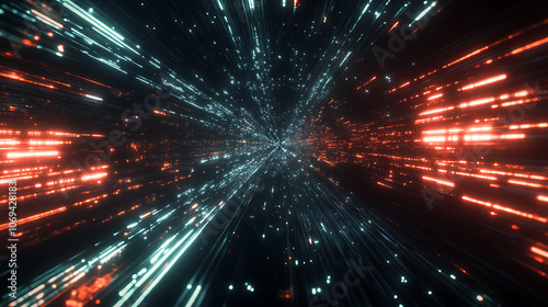 Optical data concept depicted by abstract glowing lines on a dark background, The high speed, vast capacity data transmission enabled by optical fiber technology in today's digital age