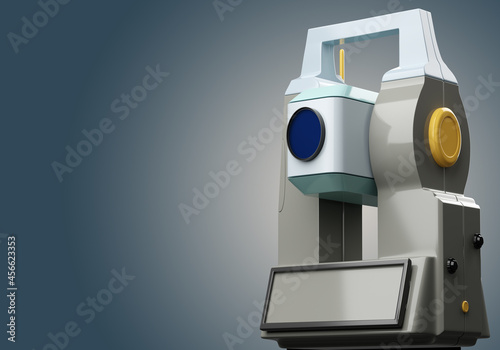 Optical level. Engineering geological surveys. Equipment for topographic survey. Theodolite on gray background. Device for geodetic works. Surveyor device. Three-dimensional optical level. 3d image