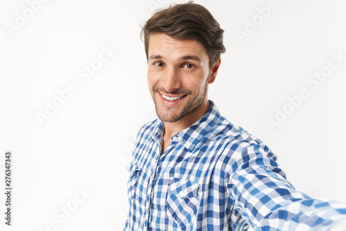 Optimistic happy young unshaved man dressed in casual shirt posing isolated over white wall background take a selfie by camera.