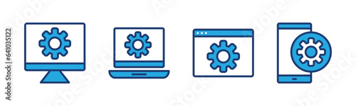 Optimization icon. Gear on devices. Sync process, option, control panel, settings icon symbol. Vector illustration