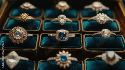 Opulent display of diamond and sapphire rings arranged in velvet trays under soft lighting.