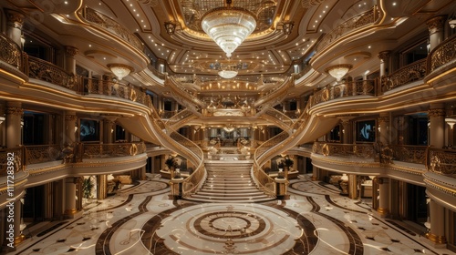 Opulent grand staircase in a lavish palace interior with marble floors and gold accents.