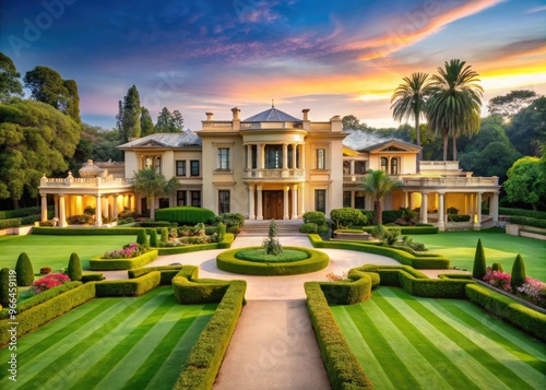 Opulent Mansion With Sprawling Grounds, Manicured Lawns, And An Elegant Facade, Exuding Grandeur And Exclusivity