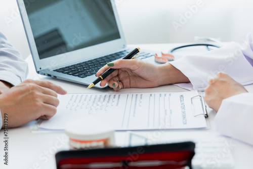 oral dentistry Female dentist in machine talking with male patient on table in clinic, dental model, dental health care according to prescription