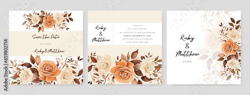 Orange and beige rose beautiful wedding invitation card template set with flowers and floral