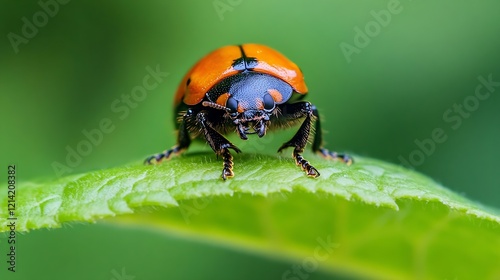 Orange and Black Ladybug on Leaf with Green Blurry Background Macro : Generative AI