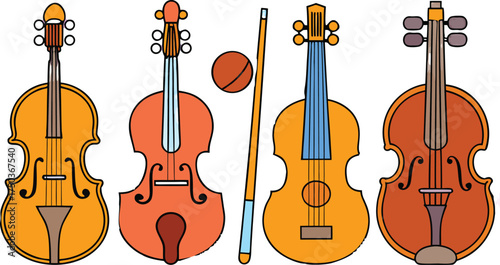 Orange and brown string instruments with blue accents and a bow violin cello