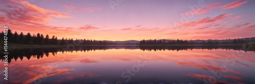 Orange and pink hues of sunset reflected in a calm lake surface, lake, peaceful