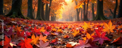 Orange and pink maples leaves scattered on forest floor, forest, orange, foliage
