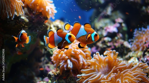 Orange and White Clownfish Swim Near Colorful Anemone in Aquarium