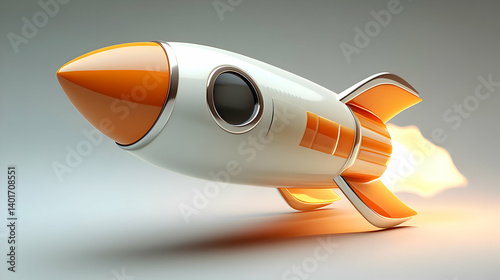 Orange and White Rocket Ship Launching with Flames Underneath on a Light Gray Background Representing Technological Advancement and Space Exploration