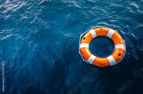 Orange and white striped life preserver floating on deep blue ocean water, isolated product shot with rope, high-resolution stock photo.