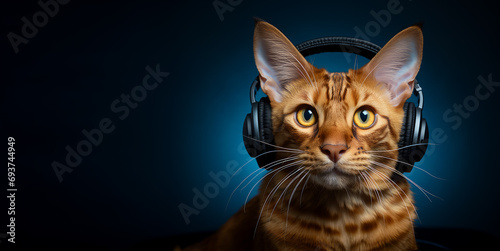 Orange Bengal cat wearing headphones on dark blue background. Music concept. Generative AI
