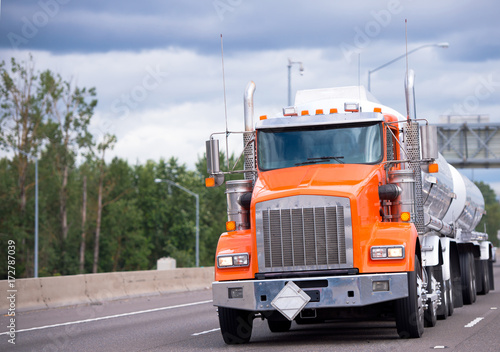 Orange big rig semi truck tractor with two tank trailers transporting fuel on the highway road