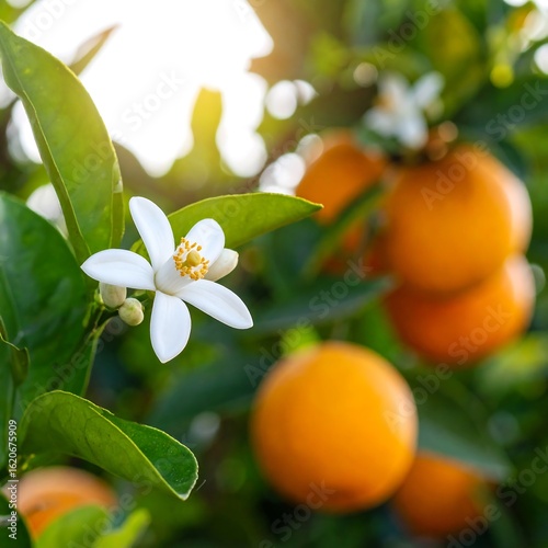 Orange blossoms on tree with fruit
