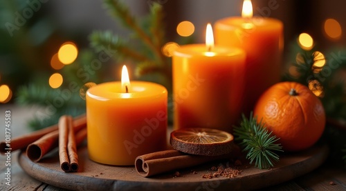 Orange candles glow warmly on a wooden tray alongside cinnamon sticks, evergreen sprigs, and a fresh orange, creating a cozy and festive atmosphere