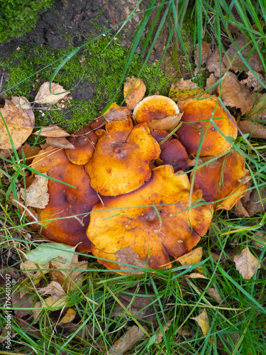 Orange caps of olive jack-o'-lantern mushrooms among moss and grass in autumn, top view