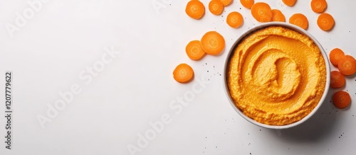 Orange carrot hummus in a bowl with scattered carrot slices on a white background Copy Space