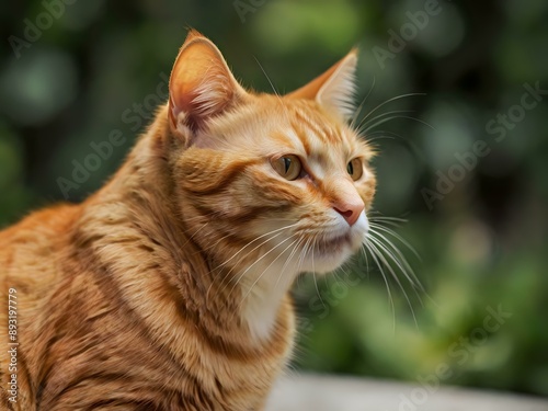 orange cat with blur background, orange cat is sitting and looking