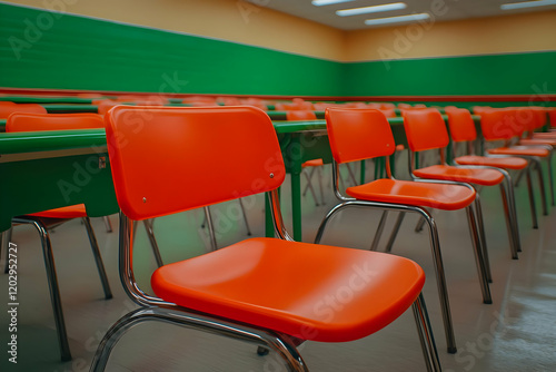 Orange Chairs and Green Tables Fill a Classroom, Ready for Students to Learn and Grow.