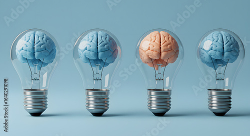 Orange colored brain inside the light bulb between the blue ones. Can be used innovation, creative idea, individuality concepts. stand out concept .