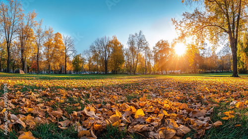 orange fall leaves in park, sunny autumn natural background