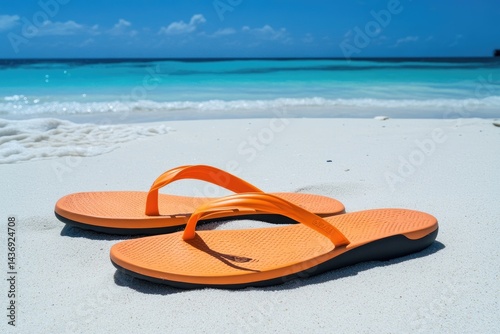 Orange Flip Flops on White Sand Beach with Turquoise Water Under Clear Sky on Sunny Day Tropical Vacation Scene