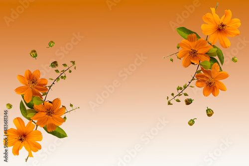 orange flowers cosmos arrangement flat lay postcard style on background orange