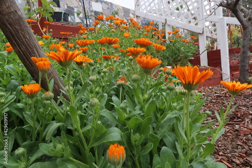 Orange Flowers in Back Yard Garden Next to a Trellis
