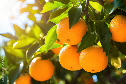 Orange garden. Fresh ripe oranges hanging on trees in orange garden. Details of Spain.