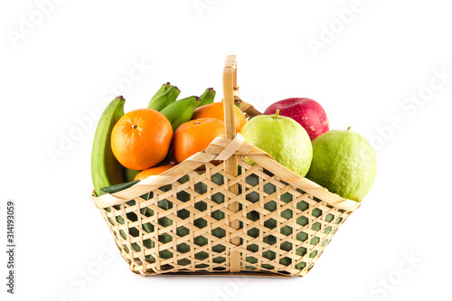 orange, guava, banana and apple in wicker basket on white background fruit health food isolated