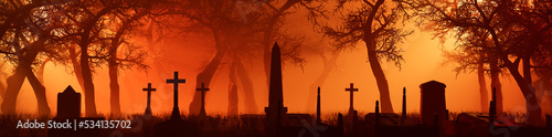 Orange Halloween Background with Graveyard in a Thick Mist. Spooky Night Scene with Trees and Tombstones.