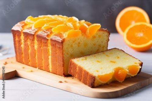 Orange homemade pound cake. Moist loaf with orange zest on bright background. Generative AI