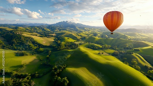 Orange Hot Air Balloon Flying Over Green Rolling Hills Landscape