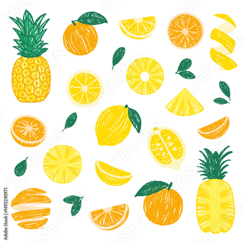 Orange, lemon, pineapple. Fruits in pastel. Pastel drawing. Chalk fruits