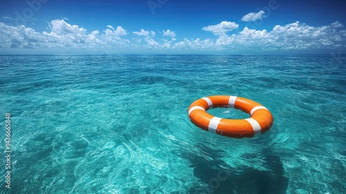 Orange life preserver ring floats on clear turquoise water under a blue sky.