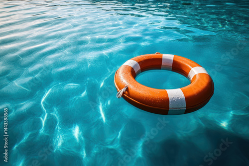 Orange Lifebuoy Floating in Blue Water. A lifebuoy floats serenely on the clear, inviting waters of a swimming pool, offering a sense of safety and summer. The water shimmers with sunlight.