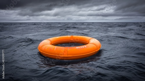 Orange lifebuoy floating in open sea - symbol of hope and safety under the wide sky
