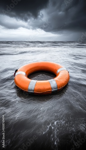 Orange Lifebuoy Floating on Dark Water with Storm Clouds, a Symbol of Safety and Rescue.