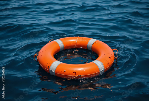 Orange lifebuoy floating on the surface of the ocean, needed help for those who fall overboard.