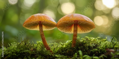 orange mushrooms growing in a mossy forest