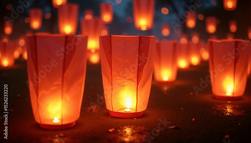 Orange Paper Lantern Floating Gently in the Night Sky with Soft Glow