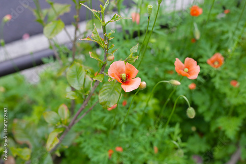 Orange poppy flowers blooming with green stems