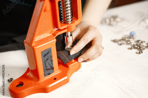Orange press for clothes. Buttons on fabric. Woman with sewing tools