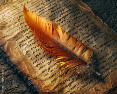 Orange quill on ancient handwritten manuscript, symbolizing traditional writing and historical study