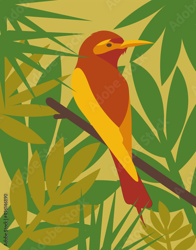 Orange, red, yellow tropicalbird on a branch in the leaves. Illustration. Icon, banner. Web. Print design. Green colors