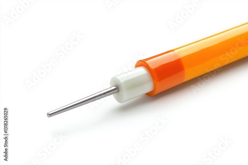 Orange stick with metal pin on white surface featuring bright studio light and clean background