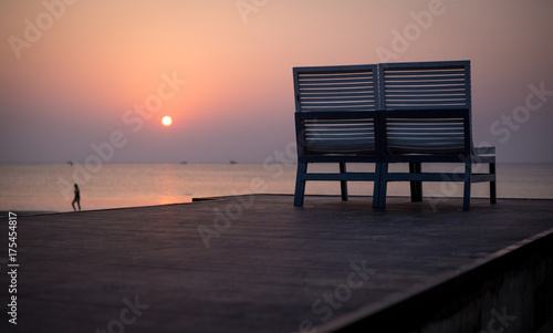 Orange Sunset beach at sea with one empty chair
